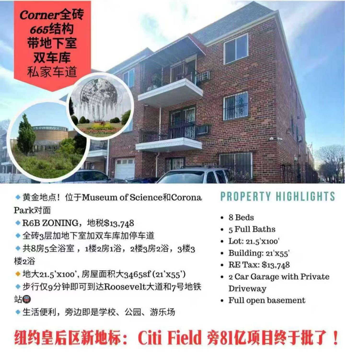 Corona 黄金地段,Citi Field 周边项目落地,房价潜力看涨。全砖双家庭住宅兼具居住舒适性与长期投资价值,适合多代家庭或出租出租获得稳定回报。大空间、多房布局、双车库和私人庭院均增加房产吸引力。