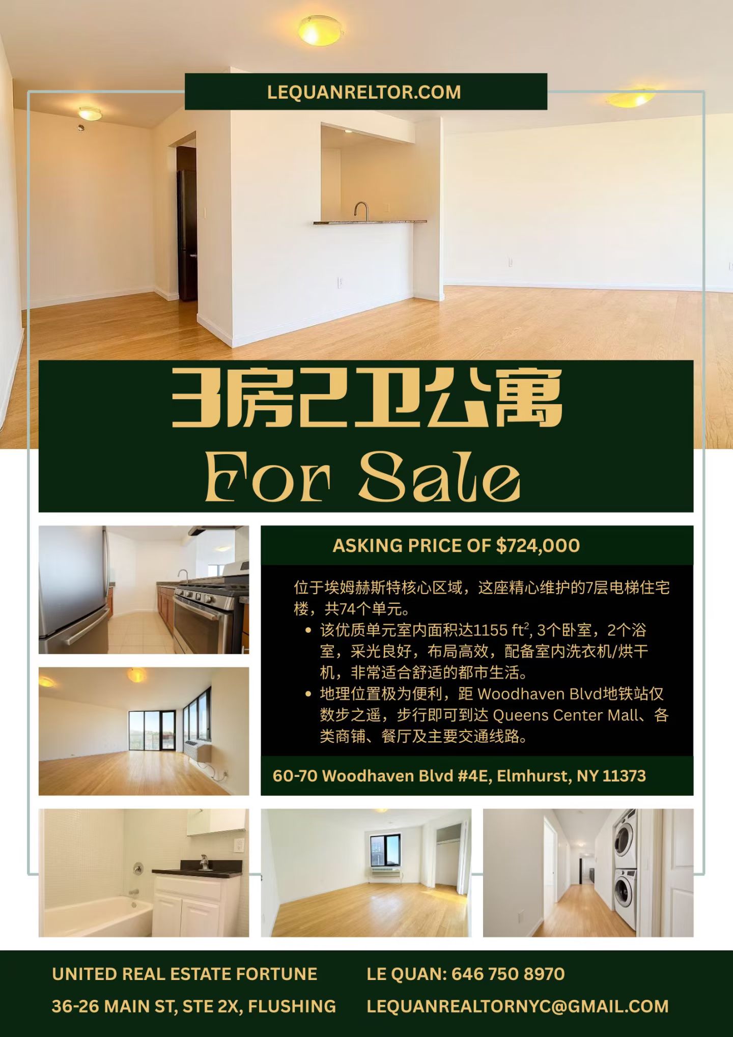 皇后区热门生活圈 Elmhurst 艾姆赫斯特 的一套超高性价比三房两卫电梯公寓现诚意出售。该单元面积约 1,155平方英尺,空间宽敞实用,布局方正合理,非常适合家庭自住或作为稳定回报的投资物业。