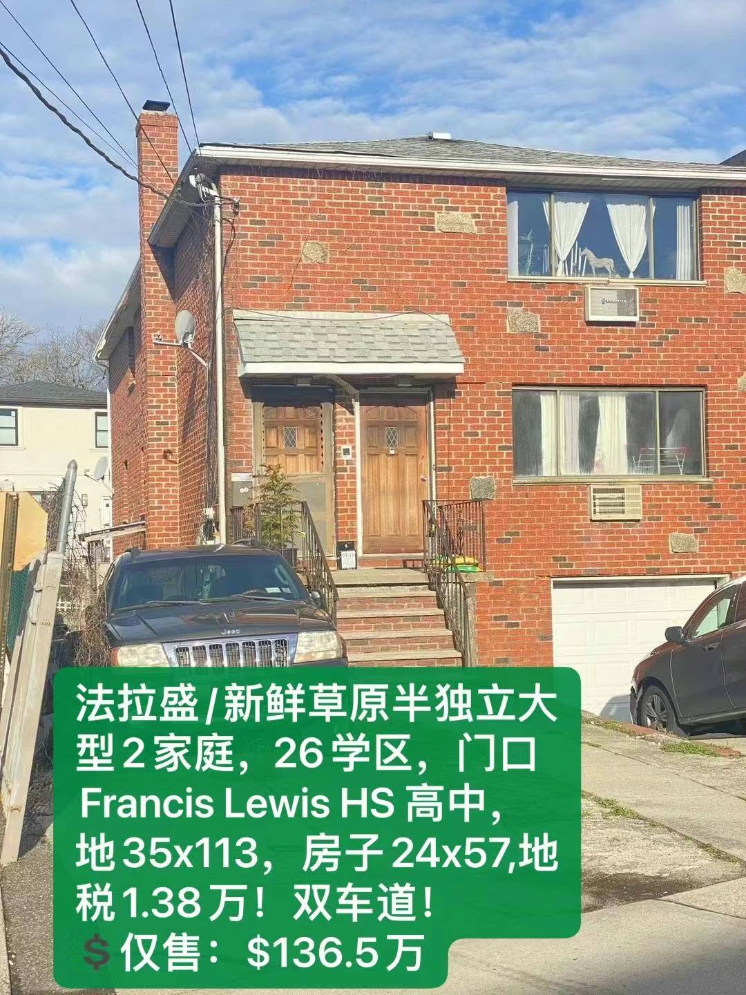 🎈🎈法拉盛/新鲜草原半独立大型2家庭,26学区,门口Francis Lewis HS 高中,地35x113,房子24x57, 地税1.38万!双车道! 1086年建