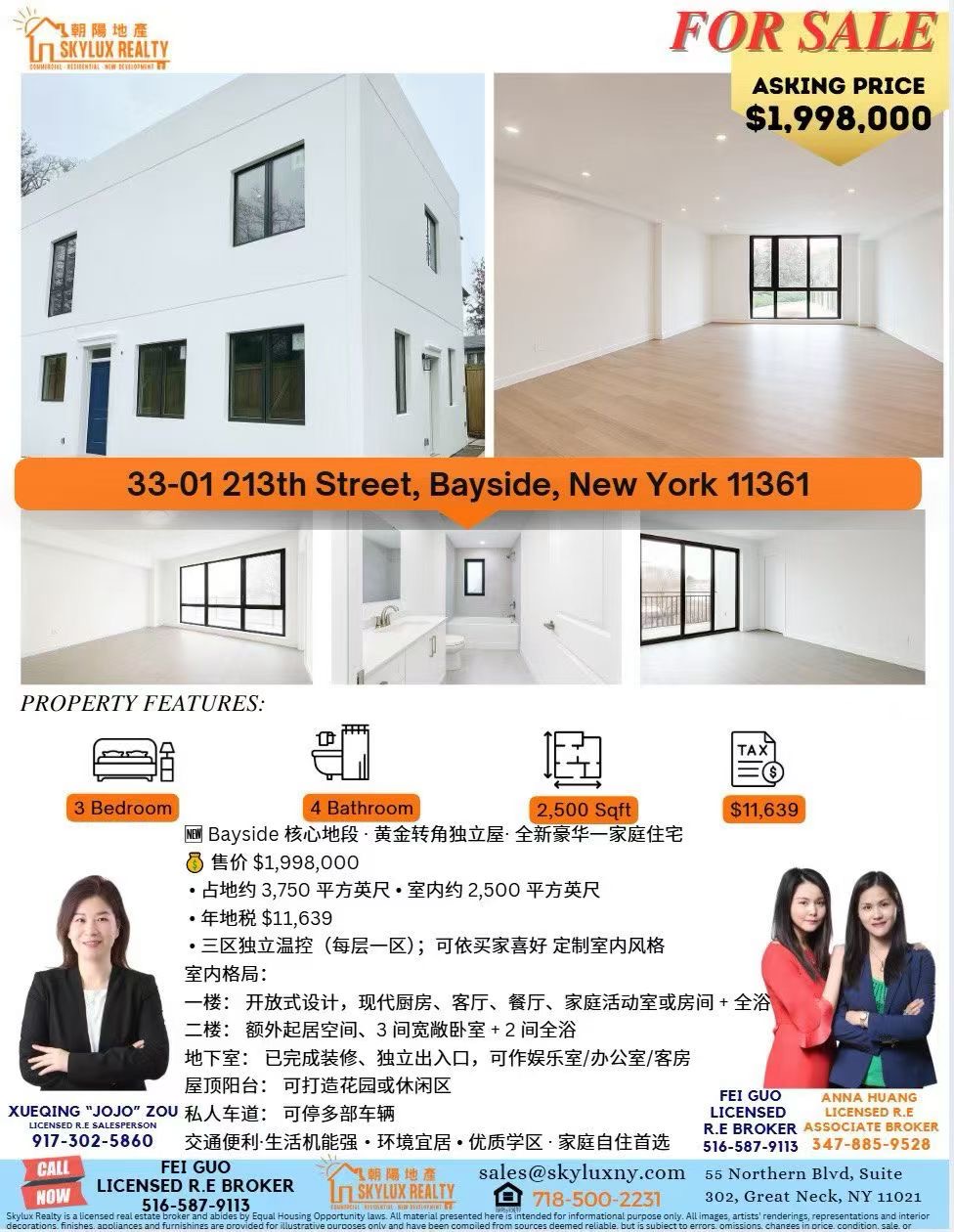 Bayside贝赛黄金转角地段,这栋全新建成的一家庭独立屋兼具现代设计、舒适空间与便利交通,是家庭自住或长期投资的理想选择。物业周边绿地环绕,生活机能齐全,交通便捷,是纽约北岸高品质住宅市场的稀缺标的。