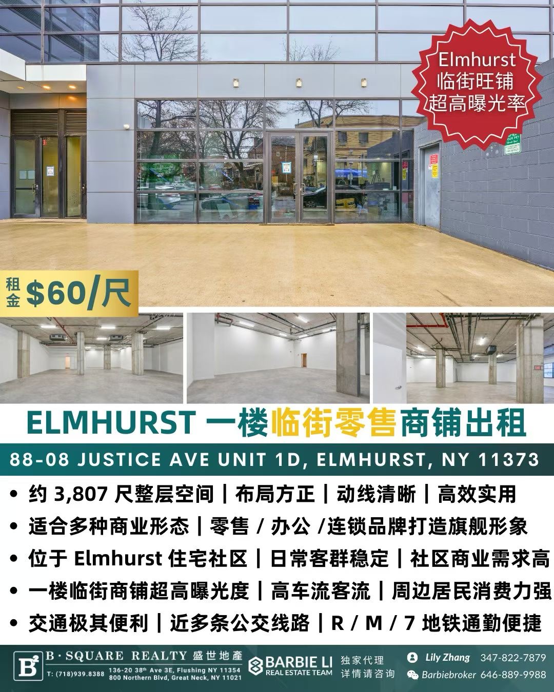 Elmhurst艾姆赫斯特核心街区,这套临街一楼整层商铺,面积约3,807平方尺,拥有极佳的街面展示与高曝光率,适合零售、诊所、品牌展示等多种商业业态,是抢占社区消费主场的理想选择。