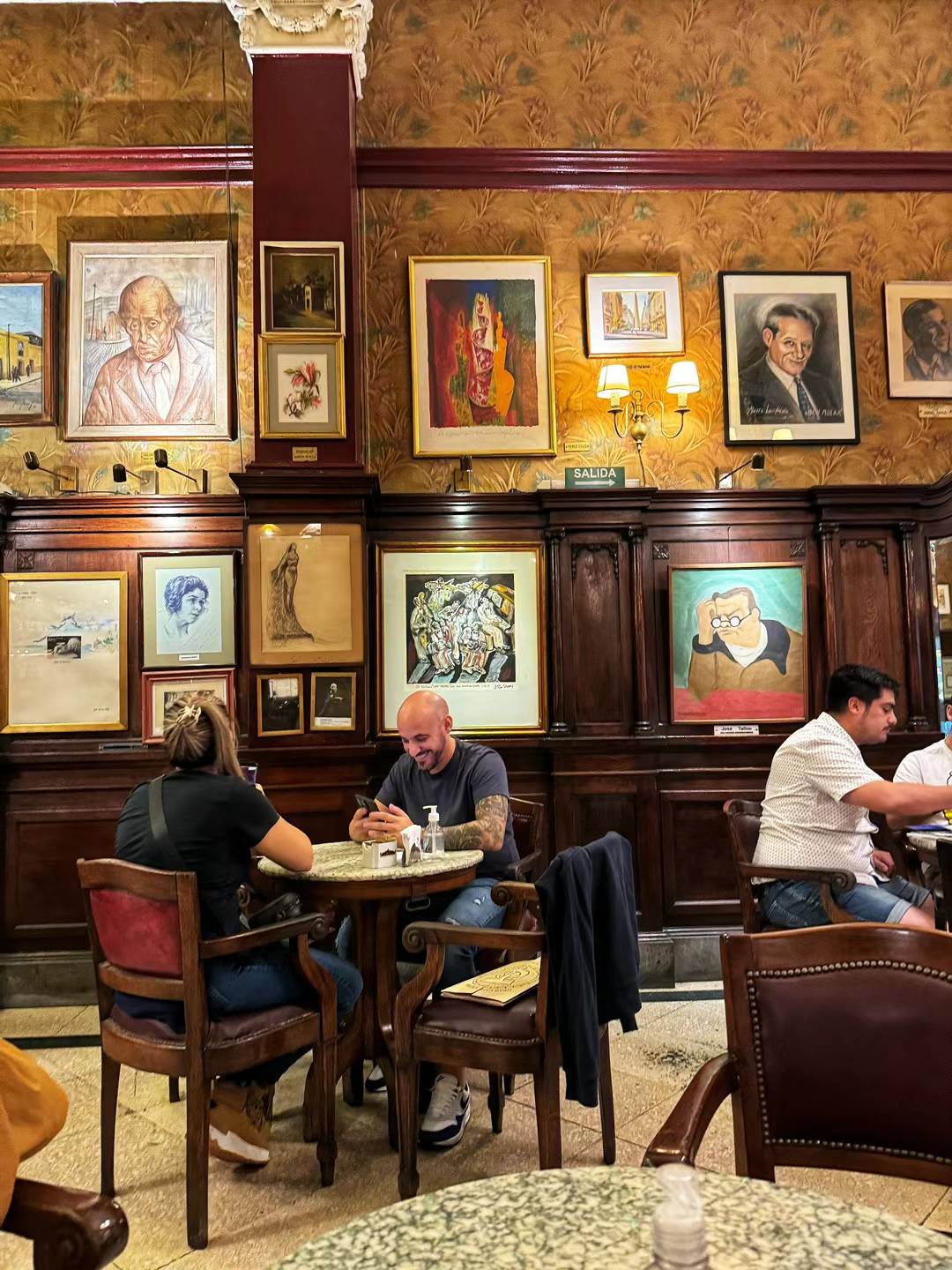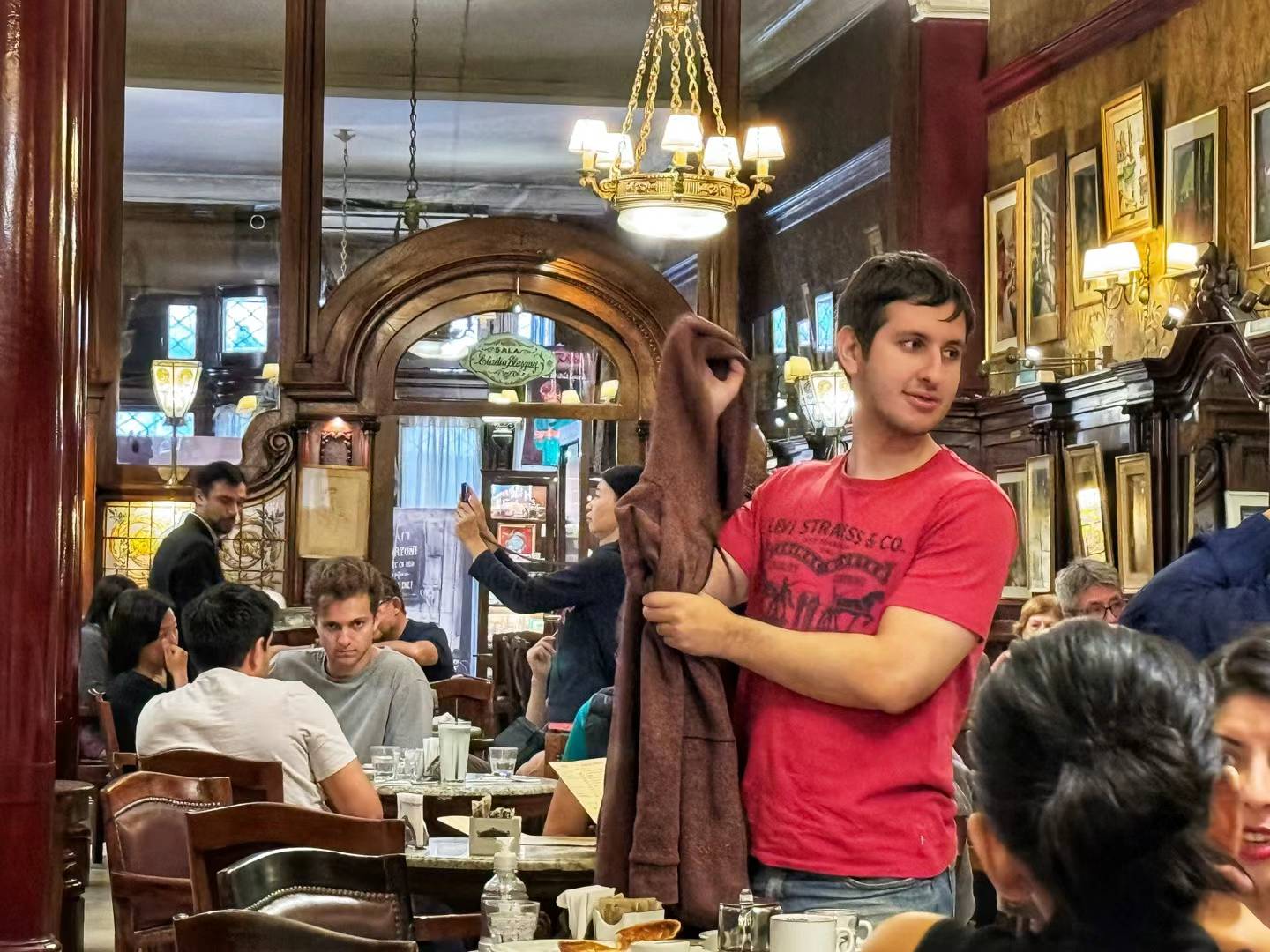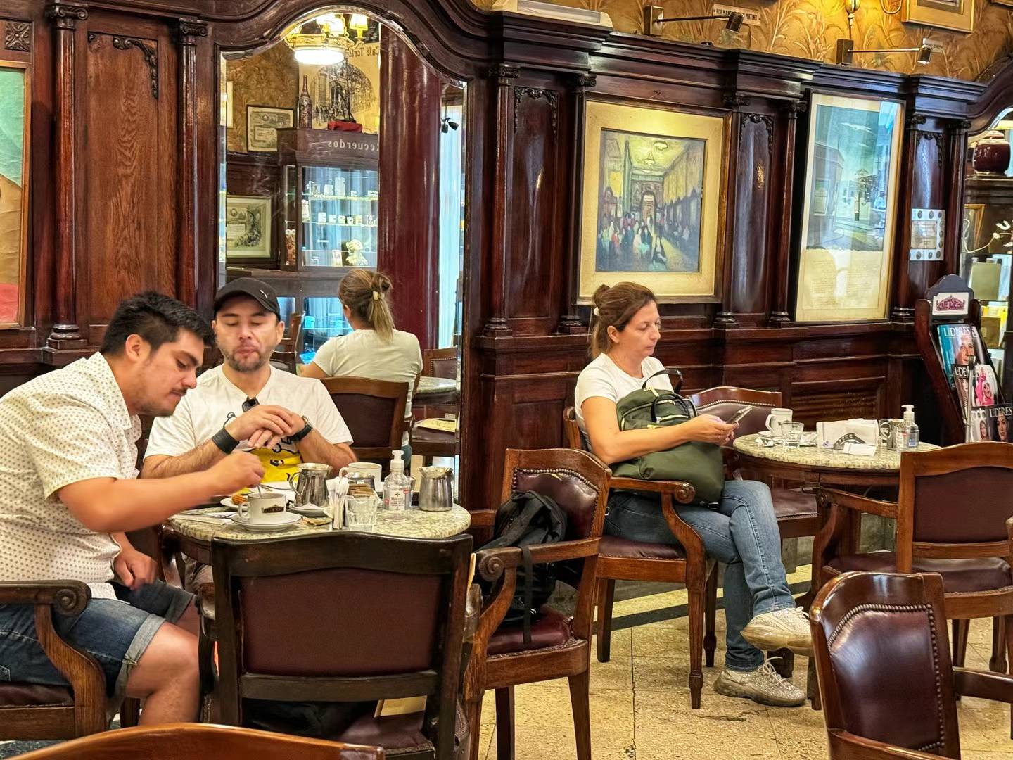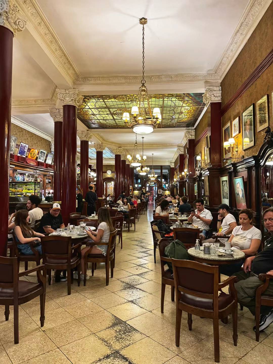 布宜诺斯艾利斯附庸风雅之旅(五):托托尼咖啡厅(Cafe Tortoni) 是阿根廷首都布宜诺斯艾利斯最具代表性的咖啡馆之一, 由一位法国移民于 1858 年开设,距今已经166年,是探戈歌手和文人经常光顾的地方,科学界泰斗爱因斯坦也来过,因此马因斯坦也慕名前来,排了半小时的队,终于被安排一个小桌子,坐下来品尝。说实话我闻到了166年前咖啡的香味。一个品牌能够经久不衰,自然是有道理的,它首先是一种文化,其次是一种品味,就像长沙城里的火宫殿,不同的是这个咖啡厅很安静,火宫殿里人声鼎沸,两种不同的文化。喝完166年前的咖啡就去一个剧院观看阿根廷探戈秀,在剧院的大堂里一队婀娜多姿的舞者从我眼前经过,说实话,我有点飘飘然。
