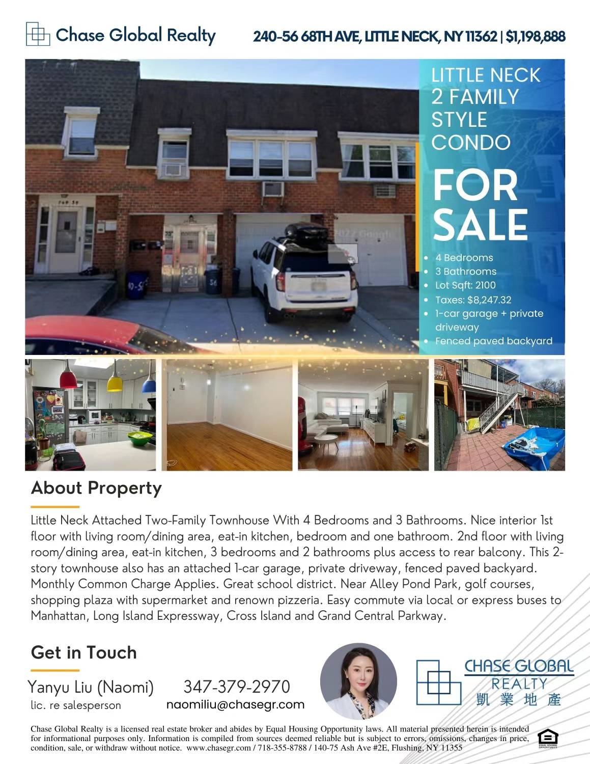 ‼️凯业地产 Little Neck小颈4房3浴连栋联排2家庭格局别墅康斗 新上市🔥