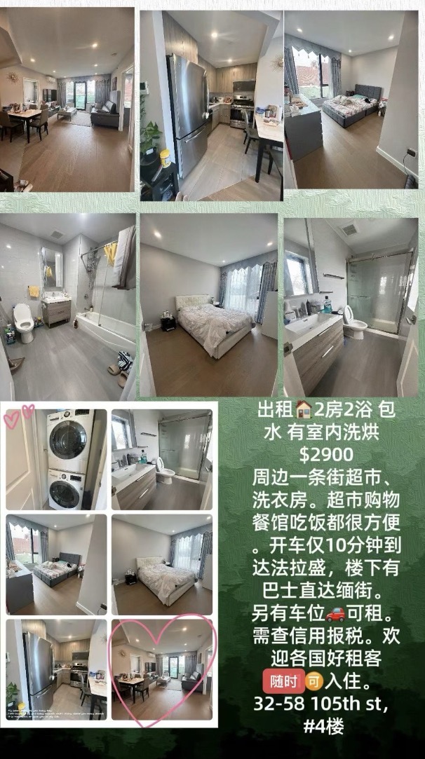 在皇后区租房市场持续活跃的当下,一套兼顾空间、地段与生活便利度的优质两房公寓正式开放出租。位于 East Elmhurst 核心生活圈,4楼安静户型,配备室内洗衣烘干机,租金$2900包含水费,支持随时入住。无论是家庭居住、合租配置,还是通勤族换房升级,这套房源都具备实用与性价比的双重优势。