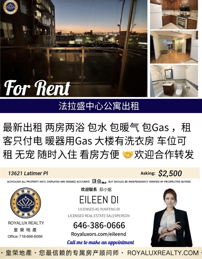 法拉盛两房两浴在$2500价位区间具备较强竞争力,尤其包含多项费用。欢迎合作转发,如有客户需求或个人租住计划,建议尽早联系预约。