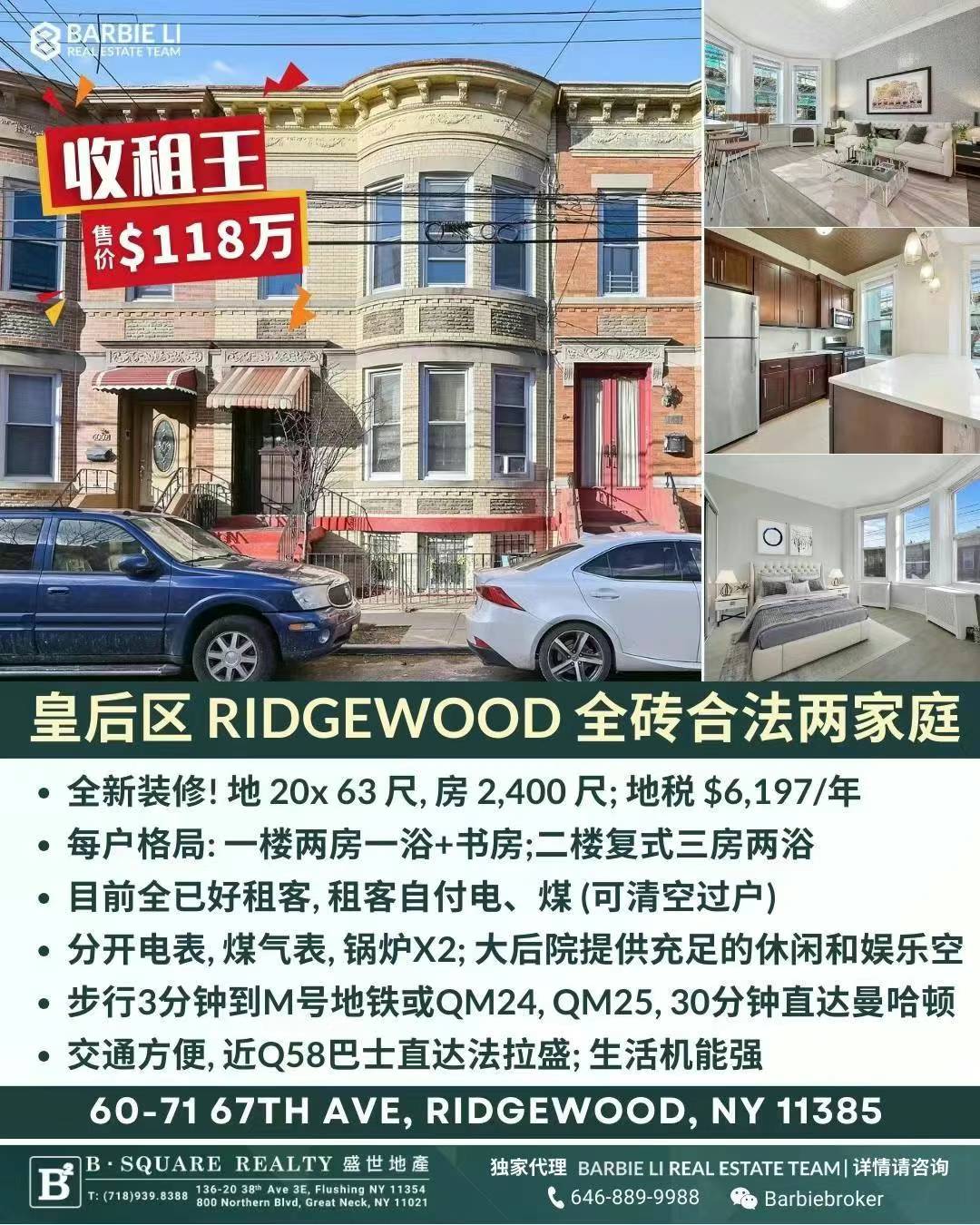 皇后区热门投资地段Ridgewood 合法新装修两家庭!好租客$3082/$2639 月租 🉑清空
