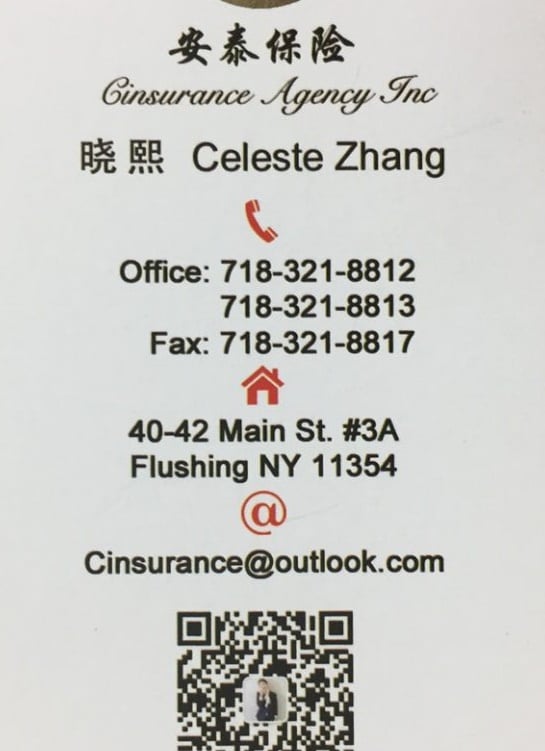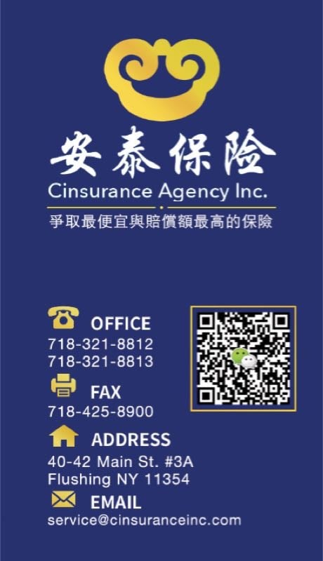 安泰保险 Cinsurance Agency Inc. Office: 718-321-8812/718-321-8813 Fax: 718-321-8817地址:40-42 Main St. #3A Flushing NY 11354 邮箱:Cinsurance@outlook.corn