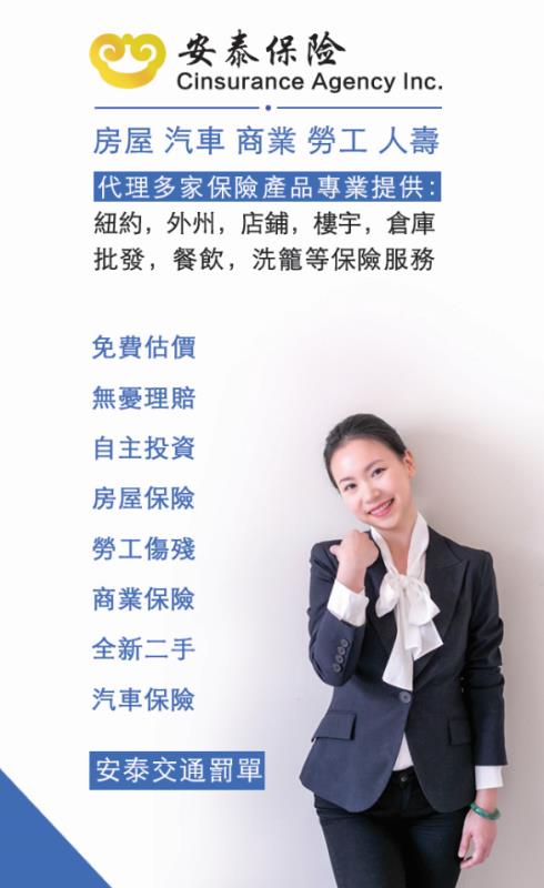 安泰保险专精全美东的医生、律师、餐馆、洗笼、美容、美甲各领域的保险服务,为您提供自住或投资的房屋保险、全新或二手的汽车保险、劳工伤残或商业保险等服务。