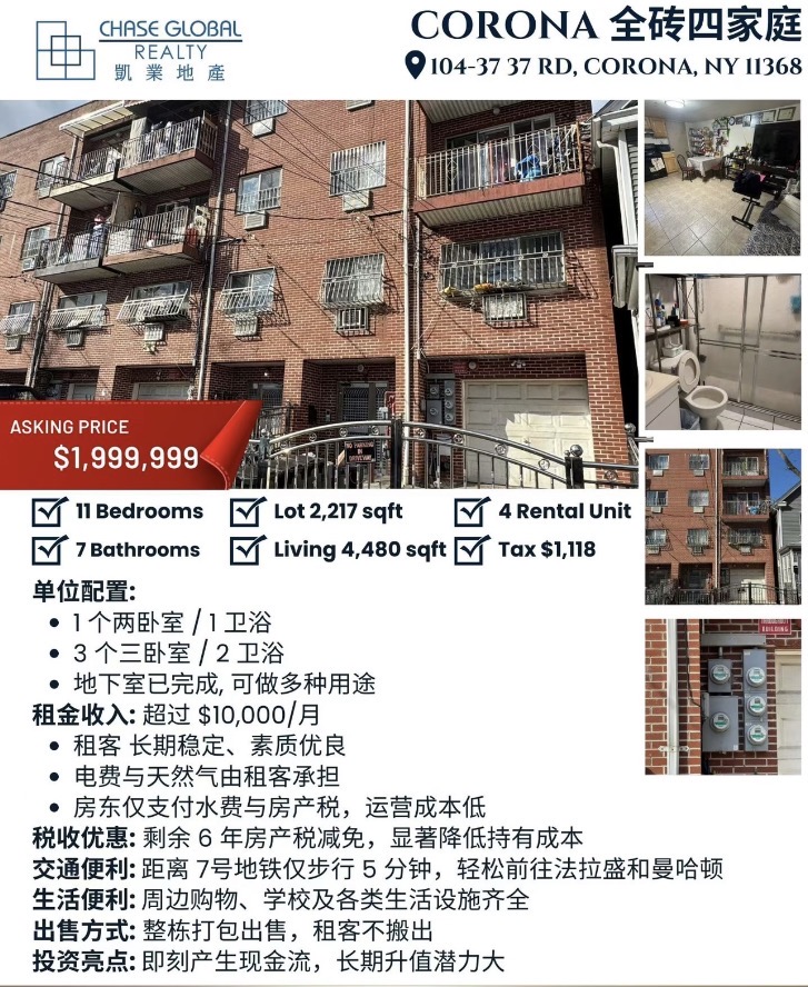 纽约皇后区核心社区 Corona(可乐娜),这栋 四户住宅(Quadruplex) 建于 2004 年,总建筑面积约 4,480 平方英尺,是投资者梦寐以求的现金流利器。整栋物业 整租出售,租客将继续居住,投资者无需担心空置风险,即刻开始获得稳定收入。