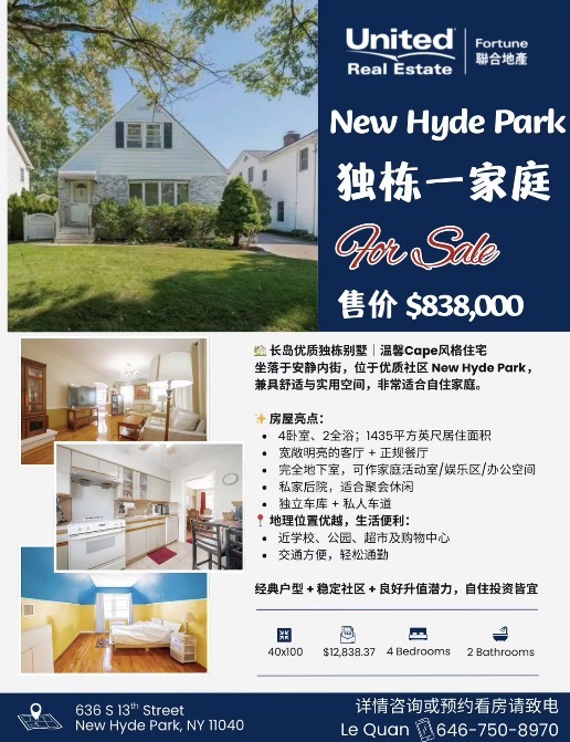 这套 New Hyde Park 独栋 Cape 风格住宅,结合 经典户型、舒适空间、独立车库、灵活地下室及优质社区,是家庭自住和投资者的理想选择。机会难得,价格合理,值得加入看房清单。