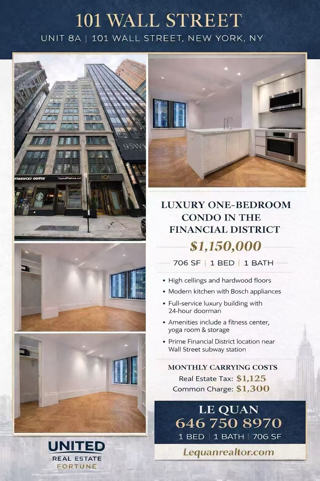 纽约金融区核心地段 101 Wall Street,这套 豪华一居室公寓(Unit 8A) 将现代设计与便利生活完美融合,是投资者或单身/小家庭的理想选择。坐拥 金融区黄金位置,步行即可到达 Wall Street 地铁站,周边金融、餐饮、购物设施齐全。