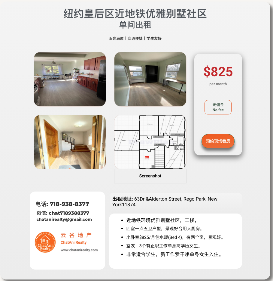 出租地址: 63Dr &Alderton Street, Rego Park, New York11374
