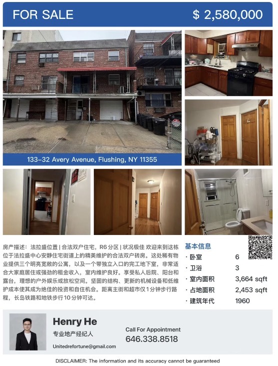 位于 Cherry Ave 与 Kissena Blvd 黄金地段,这栋 年轻8家庭全砖联排住宅 是法拉盛市场极少见的稀缺投资与自住兼顾房源。物业产权干净、屋况极佳,带租客出售,买家过户即可收租,适合 1031 Exchange 投资房产转换 或自住加出租组合使用。