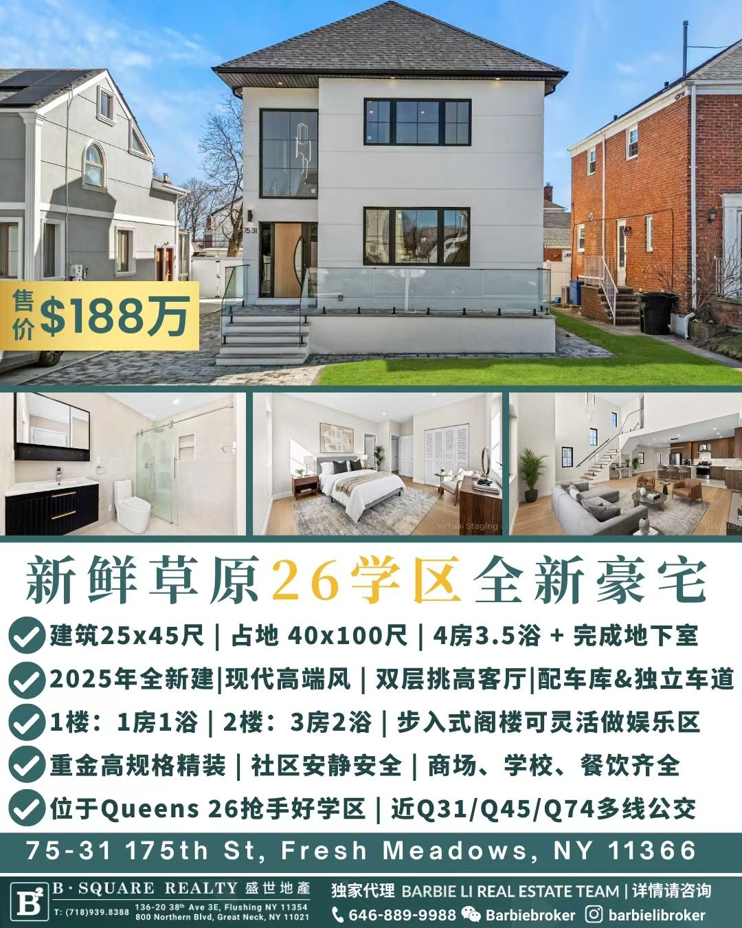新鲜草原房子出售|位于 Queens Fresh Meadows 安静优质住宅区,这套 2025年全新建造的一家庭豪宅 提供 4卧3.5浴 完整格局,双层挑高客厅配落地大窗,现代高端装修风格,光线充足,通风采光极佳。物业配有 独立阁楼、完成地下室、独立车库及私家车道,可停4台车,适合多代同堂居住或自住兼娱乐。屋主斥资打造高端住宅,配备 太阳能节能系统,节能省心,长期持有价值极高。