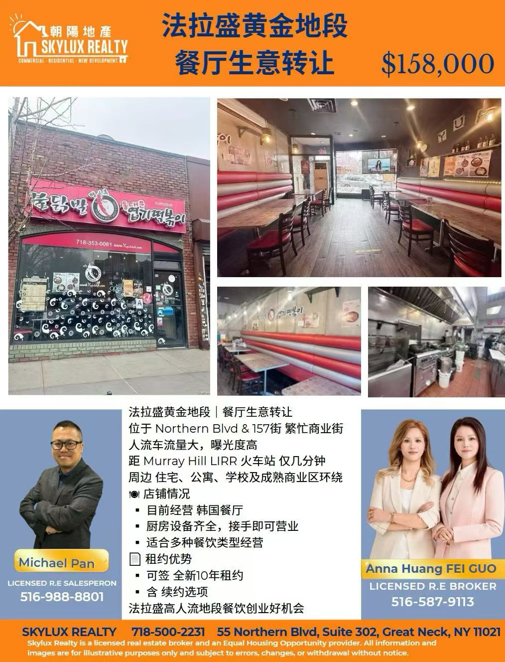 📍 位置优势:位于法拉盛 Northern Blvd & 157街核心商业地段,紧邻 Murray Hill LIRR 火车站,人流与车流量极高,周边住宅、公寓、学校及成熟商业区环绕,天然稳定客源,适合各类餐饮创业者及投资者