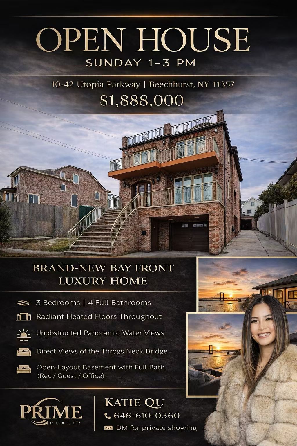 这套皇后区全新Bayfront海景豪宅为您重新定义奢华水景生活。房屋布局合理,明亮开阔,拥有宽敞客厅与高端厨房,完美融合舒适与现代感。全屋地暖系统,冬季温暖如春。每个房间都能欣赏到壮阔水景,尤其是屋顶私享露台,是观赏落日的绝佳位置。