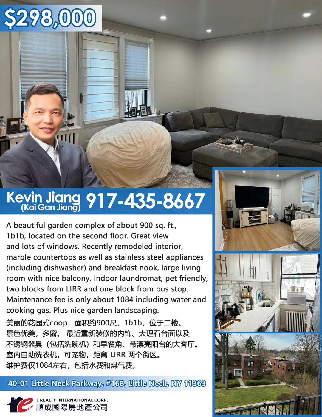 美丽的花园式coop,面积约900尺,1b1b,位于二楼。 景色优美,多窗。 最近重新装修的内饰、大理石台面以及不锈钢器具(包括洗碗机)和早餐角、带漂亮阳台的大客厅。 室内自助洗衣机,可宠物,距离 LIRR 两个街区。 维护费仅1084左右,包括水费和煤气费。