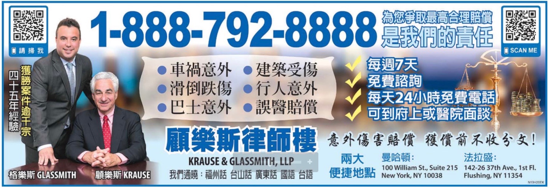 顾乐斯大律师(中文热线888-792-8888)是著名纽约意外伤害律师/车祸律师,50年来为华人争取意外伤害赔偿/车祸索赔/交通事故赔偿/滑倒摔伤/建筑工地受伤/医疗事故/工伤索赔等,为您赢得人身伤害最高赔偿。服务纽约皇后区(法拉盛),布鲁克林(八大道),曼哈顿等。理赔成功之前您无需支付任何费用。
