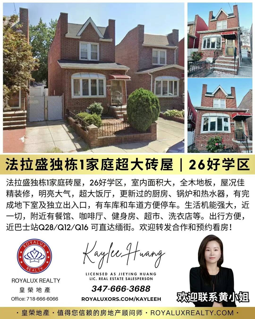 👑法拉盛独栋1家庭超大砖屋出售 | 26好学区