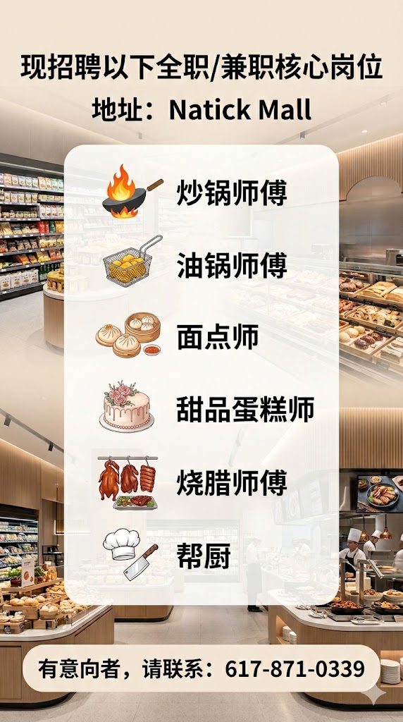 全新亚洲超市即将开业,现诚招以下全职/兼职大厨及员工: ✅ 岗位: 炒锅、油锅、面点师、甜品蛋糕师、烧腊师傅、帮厨。 ✅ 要求: 需有合法工作身份,有相关经验者优先。薪资优,面议。