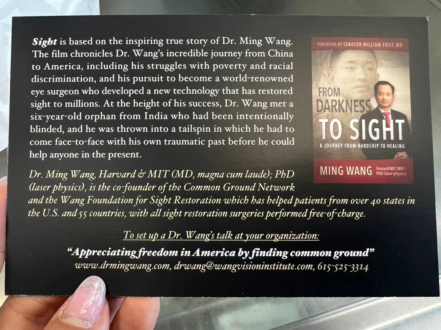 2024年4月19-21日,享誉美国的眼科手术医生王明旭和以他为原型的电影Sight即将回到纽约举行5场和观众见面活动(详情见海报)。这次见面活动是一个里程碑, 标志着王明旭医生和Sight电影全国行活动的“完满”!