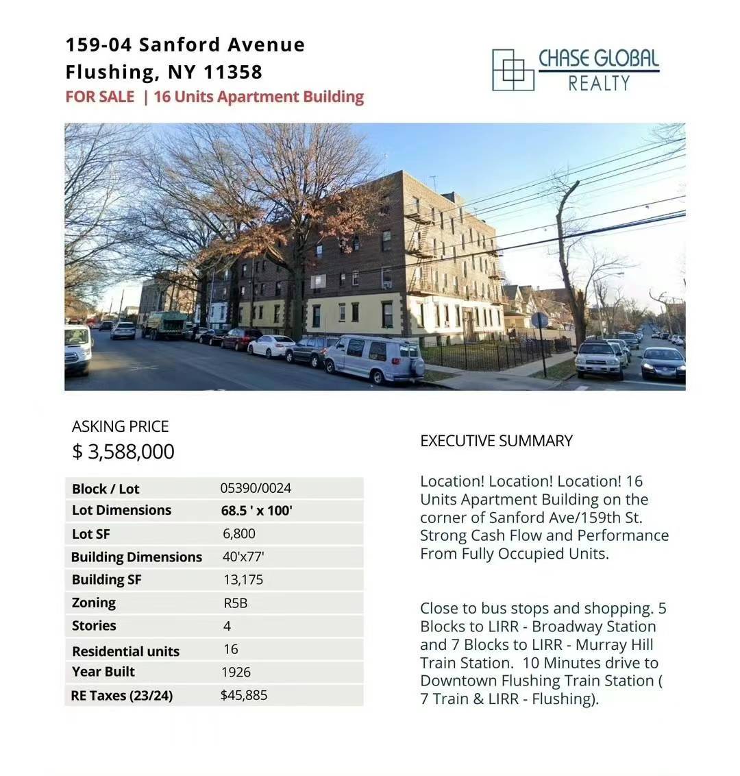 🔹黄金地段❗️位于Sanford Ave/159th St拐角处的16户公寓楼。