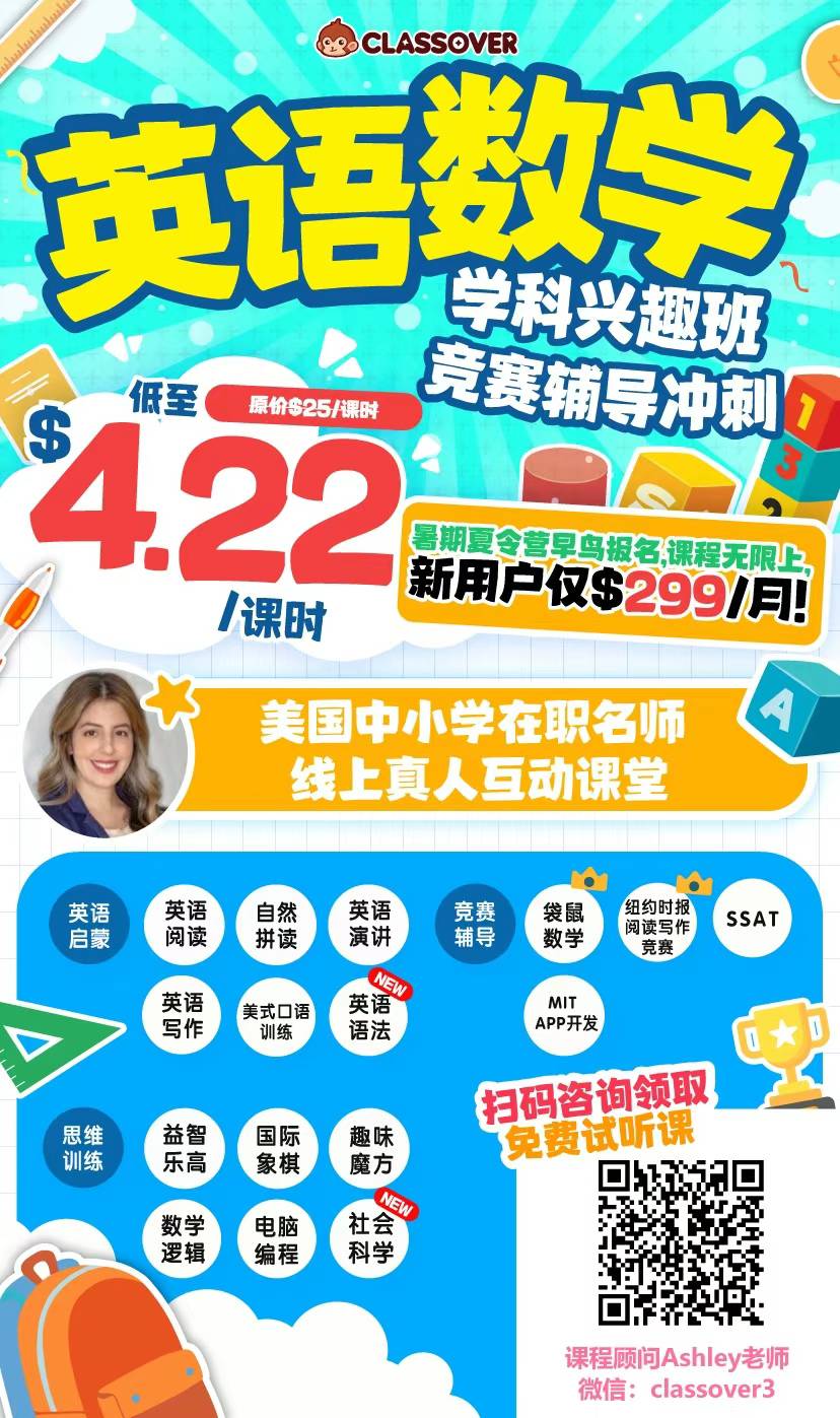 推荐我家娃一直在学的Classover北美网课,朋友家的孩子也学了好几个月,课程种类真的多,性价比很高,而且他们家老师确实很棒,都是美国中小学老师,客服也很耐心,随时都能解决问题。他们夏令营课程无限上,大家可以先免费试听下,记得用我的折扣码:OE34I2