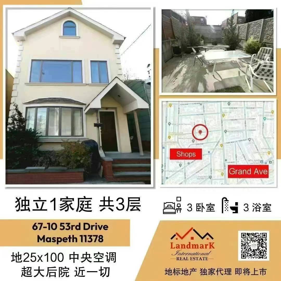 独家代理 Maspeth 独立1家庭 共三层 67-10 53rd Drive, Maspeth 11378 3卧3全浴 地25x100 超大后院 地段安静 近餐厅 商店 Grand Ave 近公交 高速 物超所值 欢迎咨询 347-575-6387