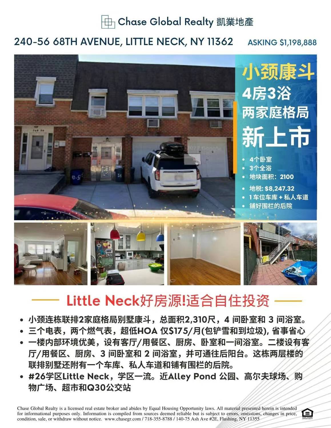 💎Little Neck小颈4房3浴连栋联排2家庭格局别墅康斗