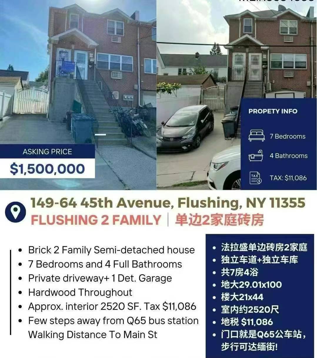 🟠法拉盛单边砖房2家庭, 独立车道+独立车库,共7房4浴