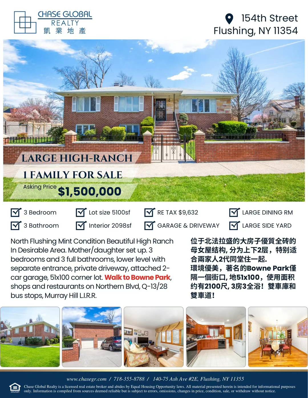居住环境非常優美,著名的Bowne Park僅隔一個街口,地51x100,3房3全浴!