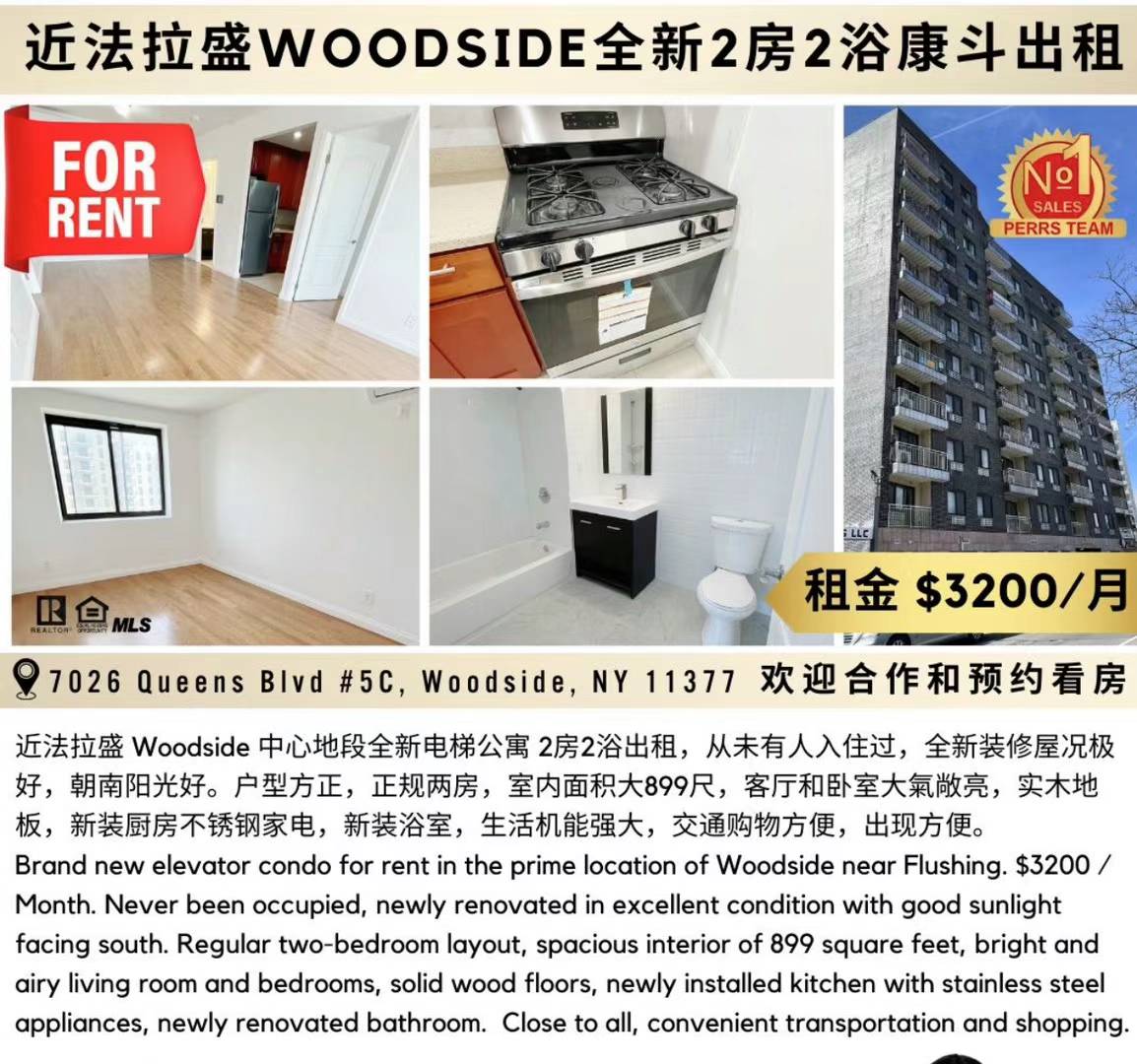 康斗介绍:近法拉盛 Woodside 中心地段全新电梯公寓 2房2浴出租,从未有人入住过,全新装修屋况极好,朝南阳光好。户型方正,正规两房,室内面积大899尺,客厅和卧室大氣敞亮,实木地板,新装厨房不锈钢家电,新装浴室,生活机能强大,交通购物方便,出现方便。$3200/月。Jamie 718-309-2982