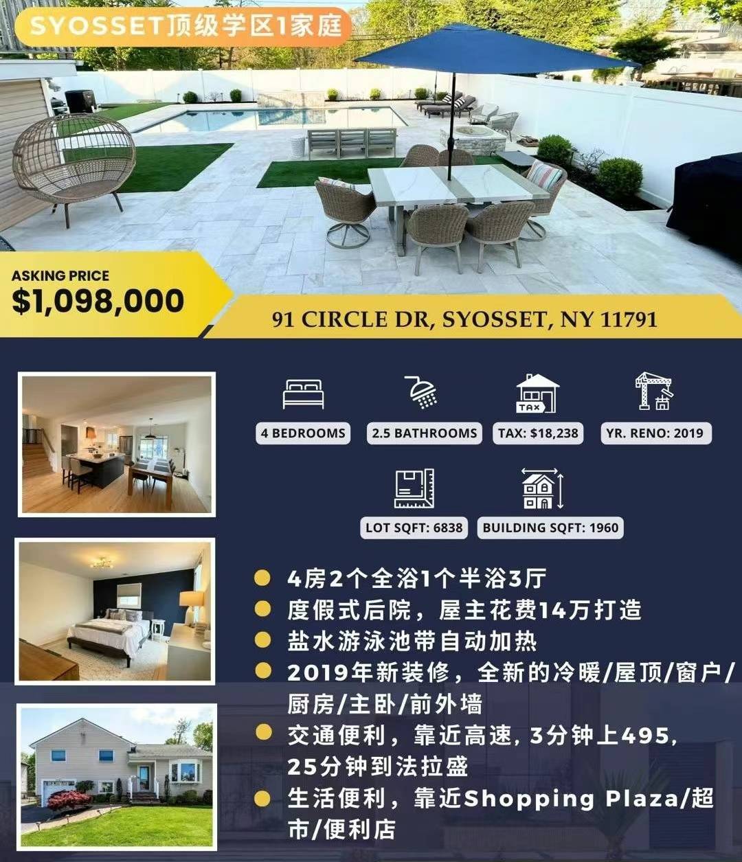 🔵SYOSSET顶级学区1家庭,4房/2个全浴/1个半浴/3个厅