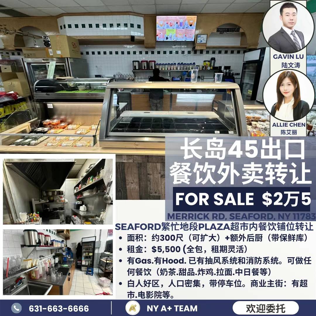 长岛45出口Seaford繁忙地段Plaza超市内餐饮铺位转让💟