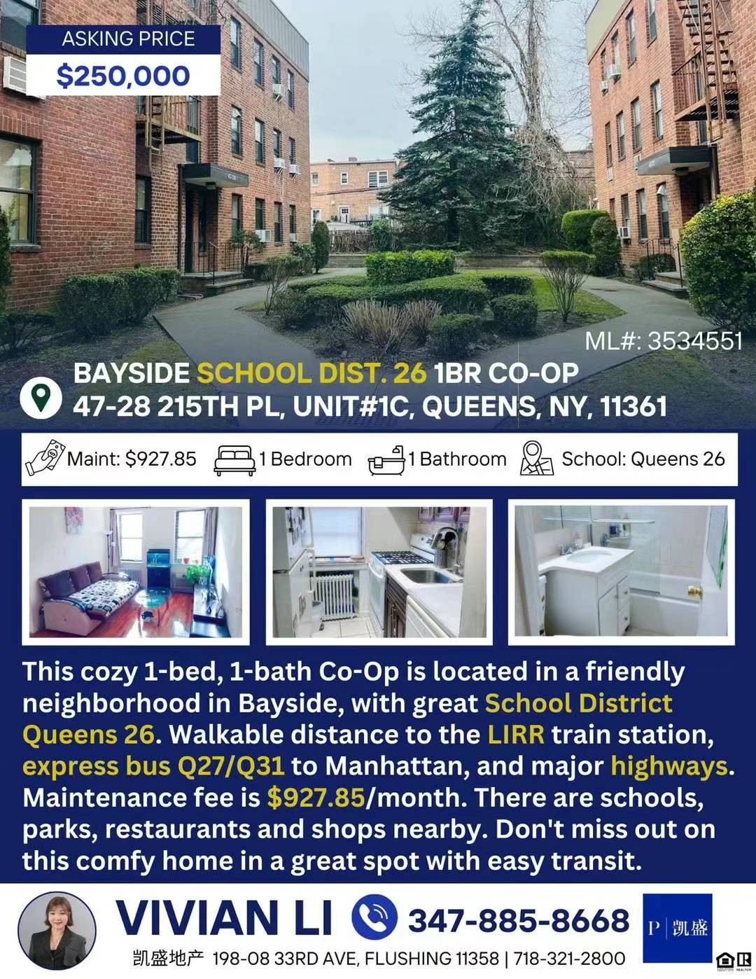 🔴位于法拉盛Bayside, 1房1浴Co-Op,空间大