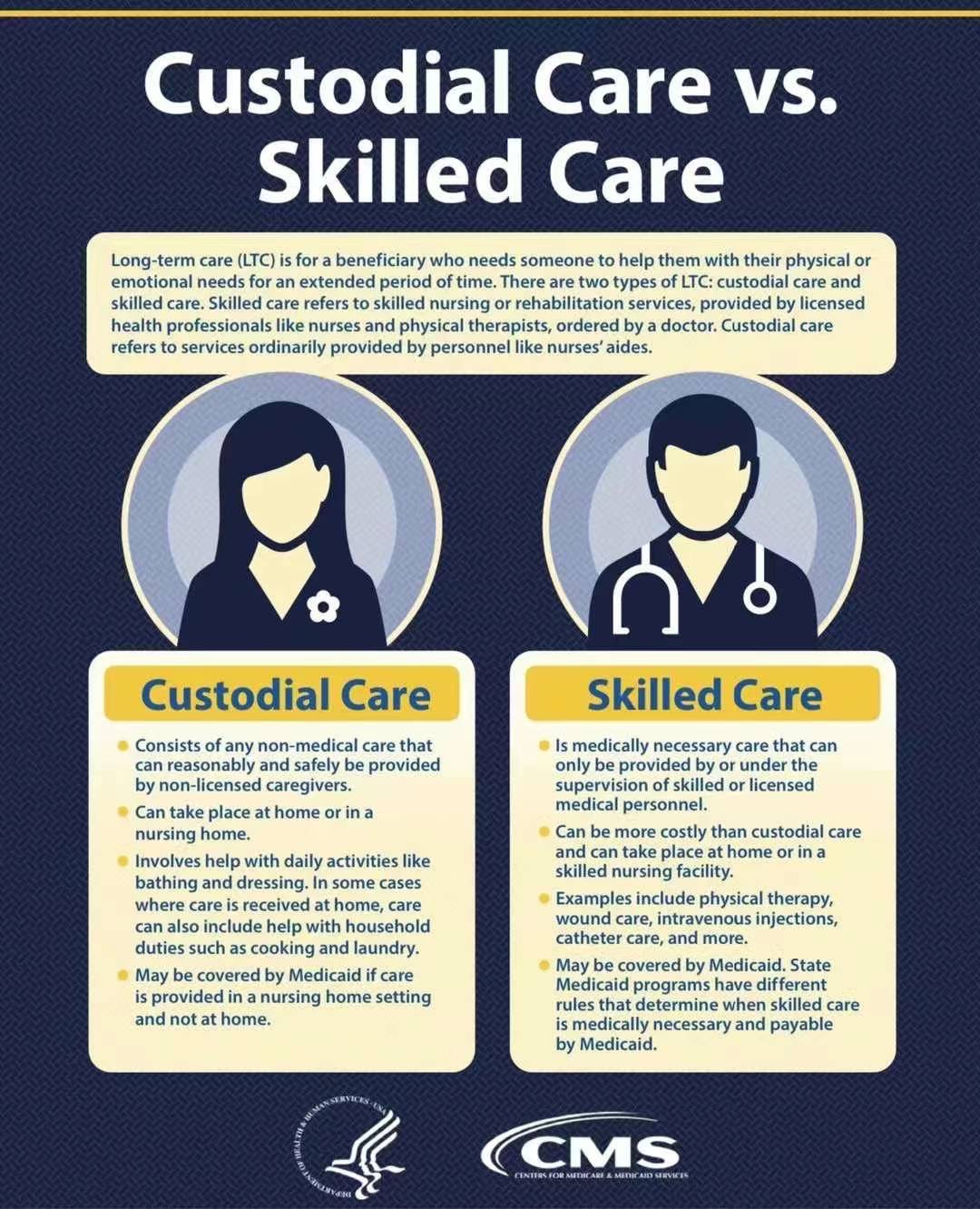 ·Skilled Care (包含物理治疗, 伤口护理, 静脉注射等却不包含日常护理)