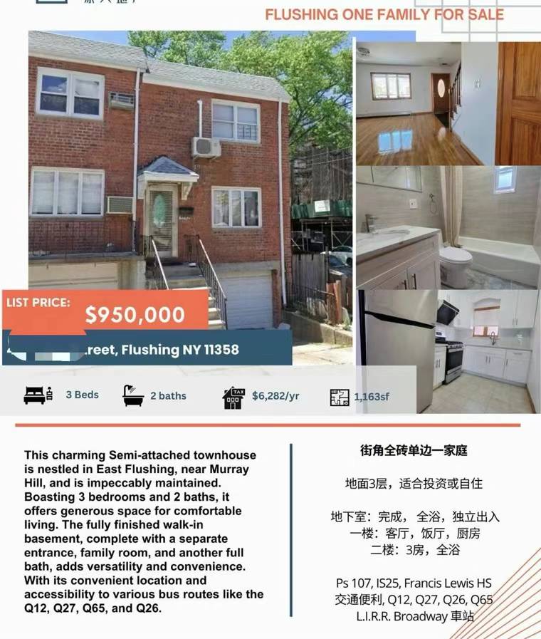 法拉盛162街商业街,街角全砖单边一家庭地面3层,3房2浴,地下室独立出入