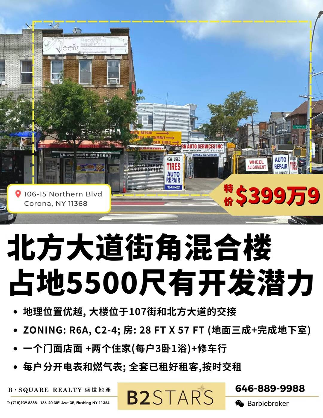 ⭐Zoning: R6A, C2-4; 房: 28 ft x 57 ft (地面三成+完成地下室)