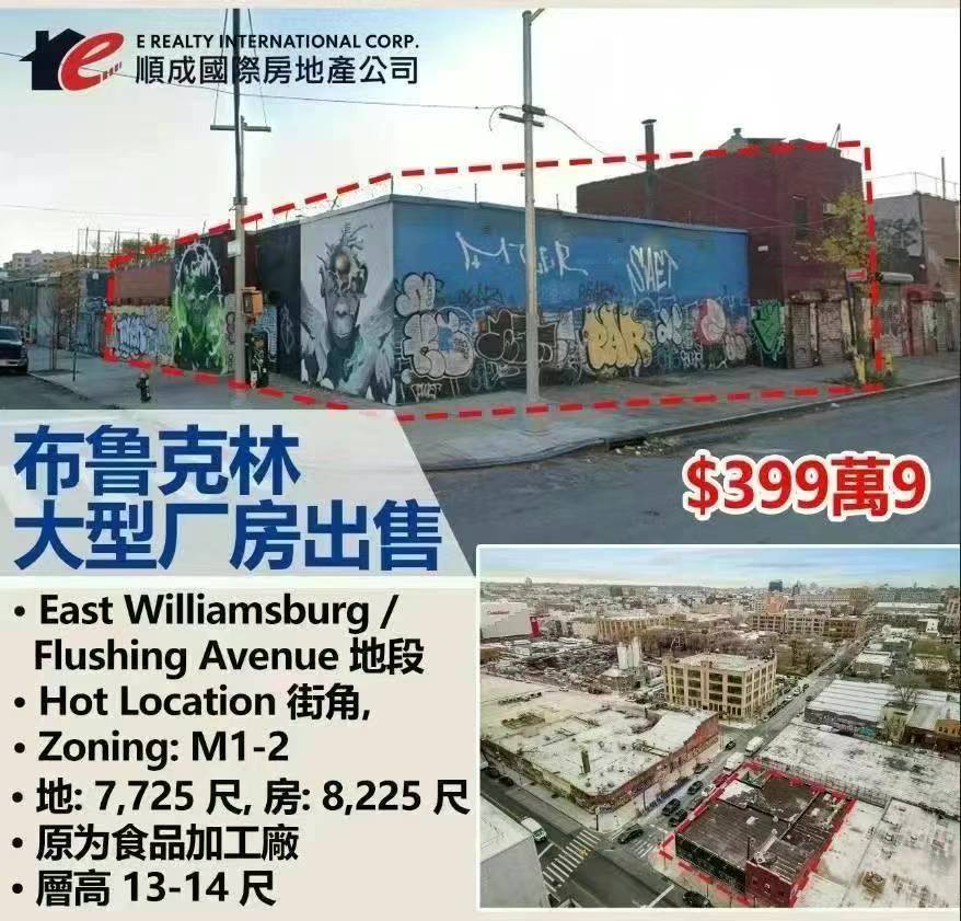 East Williamsburg / Flushing Avenue 地段 街角 地 7725 尺 房8225 尺 Zoning M1-2 原用食品加工厂 Hot Location