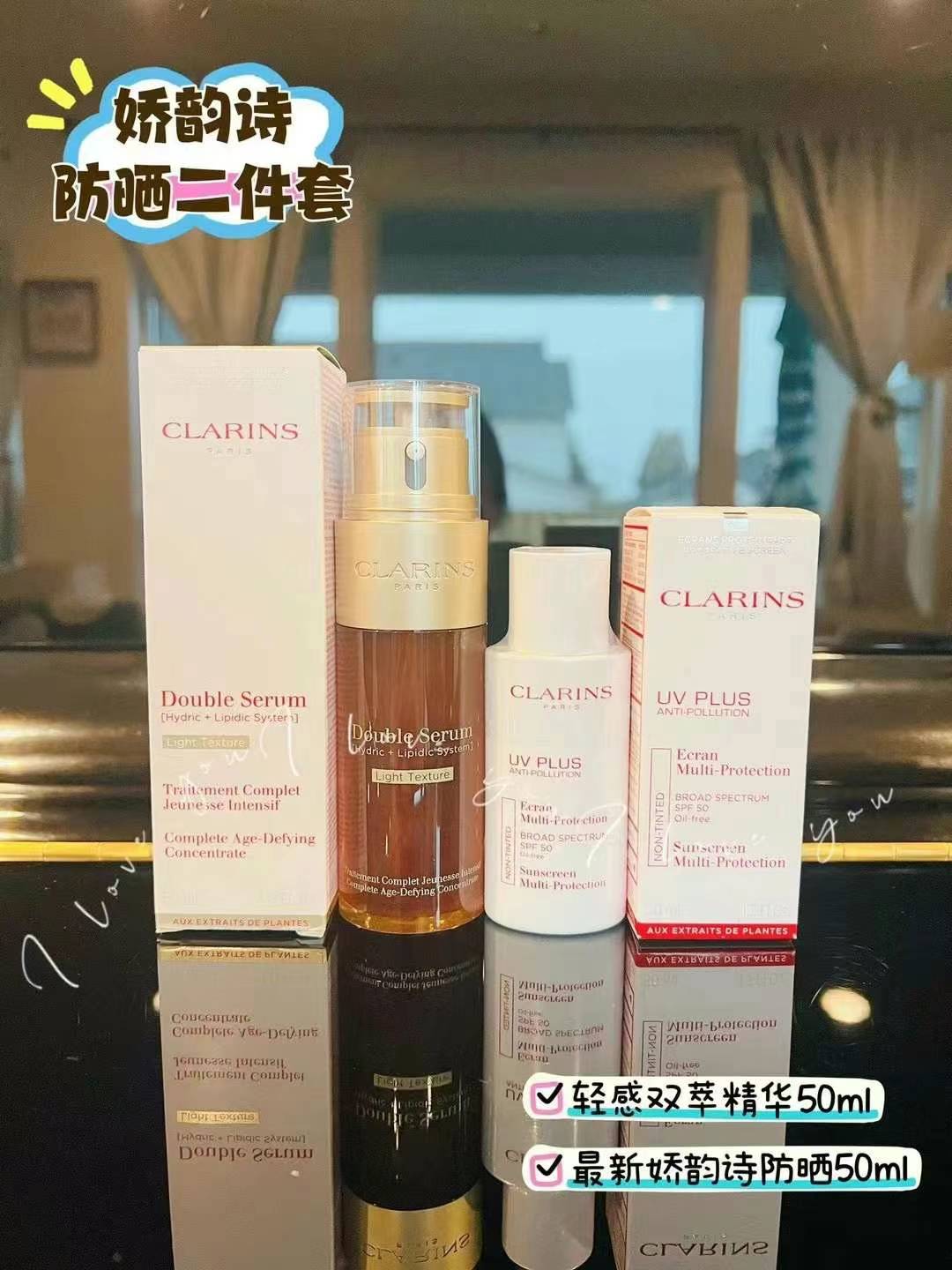 防晒防衰抗老这组成功实现!娇韵诗轻感双萃精华50ml➕娇韵诗防晒spf50 50ml,950/组直邮娇韵诗经典防晒终于在夏天到来之前,来货了,美版专柜娇韵诗,可以防晒伤+防晒黑防晒界的顶流!敏感肌及孕妇都可用的一款产品!娇韵诗这款防晒真心好用,oil free无油版本,易推开,超水肤感,不泛白无油光!SPF50高倍防晒指数,有效抵御UVA/UVB