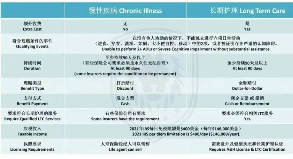 美国人寿保险中有两个条款,不少朋友都会搞混,这两个条款就是:慢性疾病条款(Chronic Illness Rider)和长期护理条款(Long Term Care Rider)。
