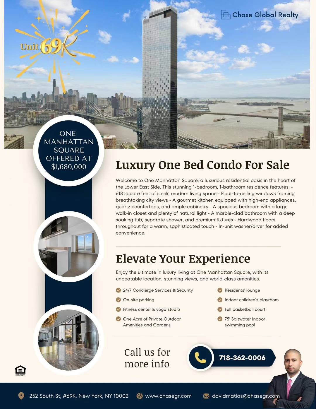 🌟曼哈顿广场一号地标大厦是一栋 80 层、800英尺高的现代玻璃公寓,位于下东区的东河海岸、可俯瞰总督岛、东河和布鲁克林大桥,全水景和天际线景观,拥有超过 100,000 平方英尺的各种奢华空间。