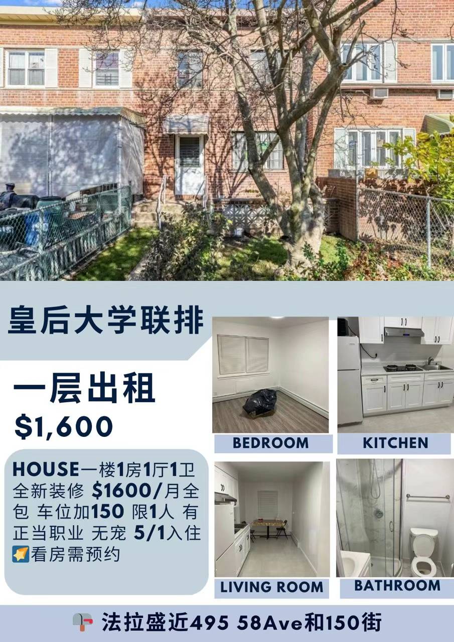近495 58Ave和150街House一楼1房1厅1卫全新装修 $1600/月全包 车位加150 限1人 有正当职业 无宠 5/1入住