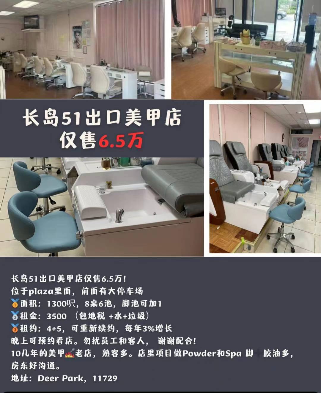 10几年的美甲💅老店,熟客多。店里项目做Powder 和Spa 脚➕胶油 多,房东好沟通。地址:Deer Park,11729