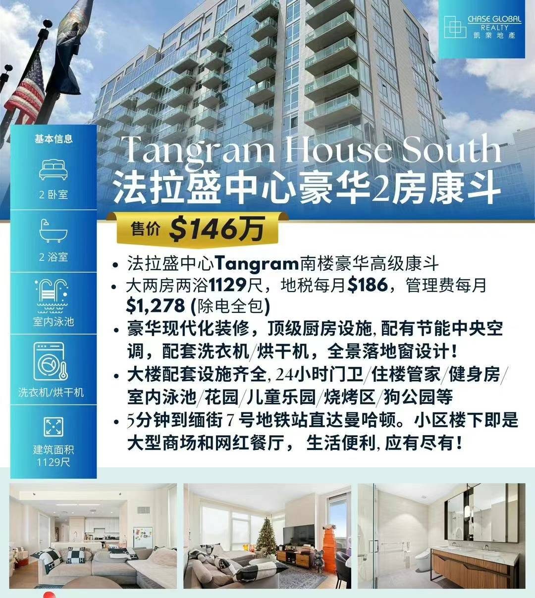 💎大两房两浴1129尺,地税每月$186,管理费每月$1,278(除电全包)