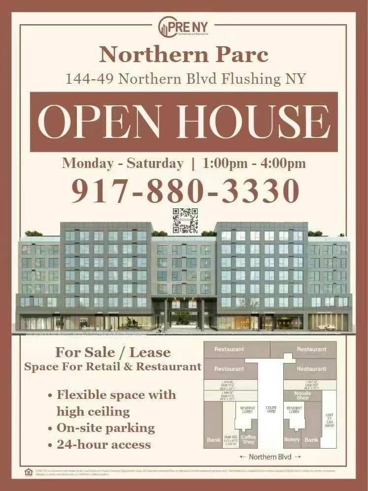 享闹市之繁华 拥园林之恬静, 近Parson 及北方大道、H-Mart、大中华超市、美国银行及众多餐厅: 汉堡王、Tacos, 紧邻Rite Aid、7-Eleven, 周边生活配套齐全., 交通便利、198 停车位、 楼下巴士站、8分钟到长岛快线、15分钟至地铁. 24小時门卫、空中花园、健身房、洗烘干机、洗碗机等应有尽有!