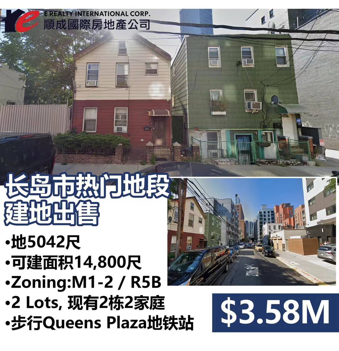 🎉順成最新代理 Long Island City Development Site For Sale , 2 lots w 2 Family Each, 3 blocks to Queens Plaza train stop .asking $ 3,58 M, 最新建地 ,現有2 棟2 家庭 , 共 5042 尺, 可建預計14,800 尺 商業+ 住家, 走路3 Blocks 到 Queens Plaza 7 車地鉄口 . 開車曼哈頓只須8 分鐘,地點— 流 ,