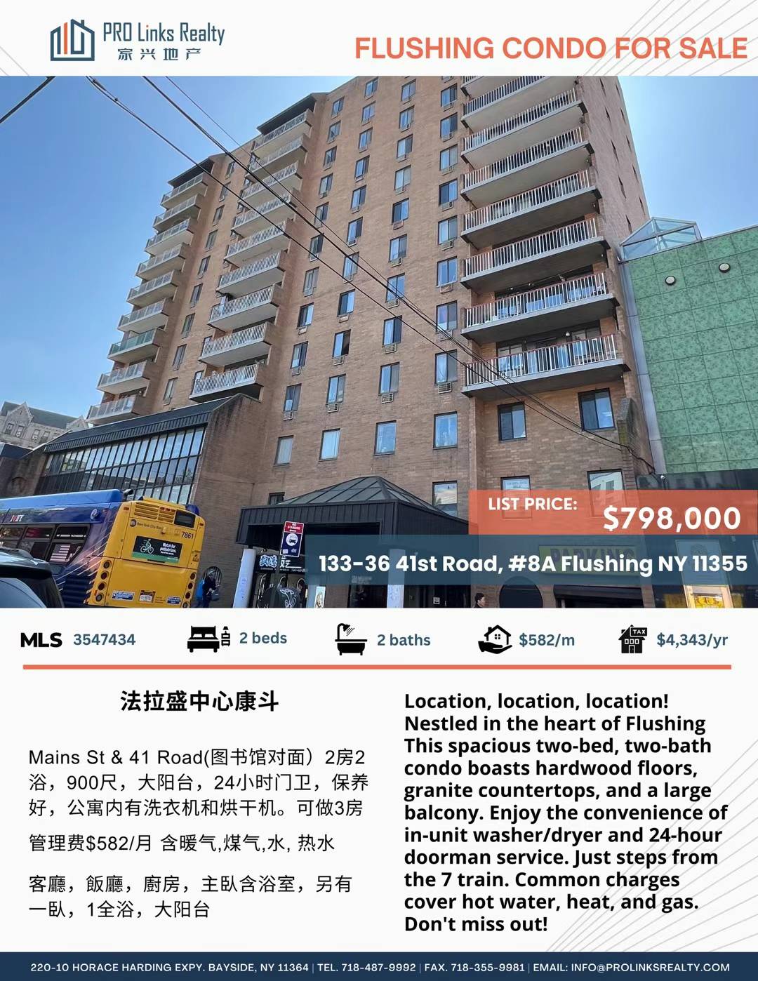 Mains St & 41 Road(图书馆对面)2房2浴,900尺,大阳台,24小时门卫,保养好,公寓内有洗衣机和烘干机。可做3房