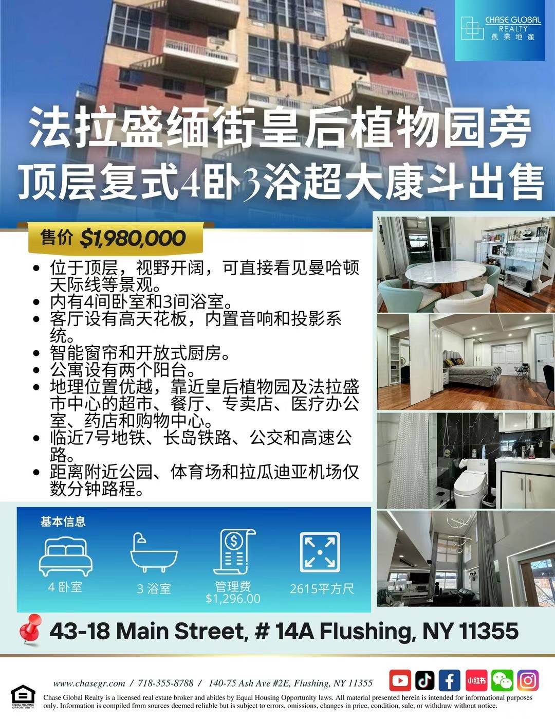 ✅4房3浴,2個封閉式陽台. 俯瞰曼哈頓華麗的天際線景觀,可遠眺整個法拉盛.