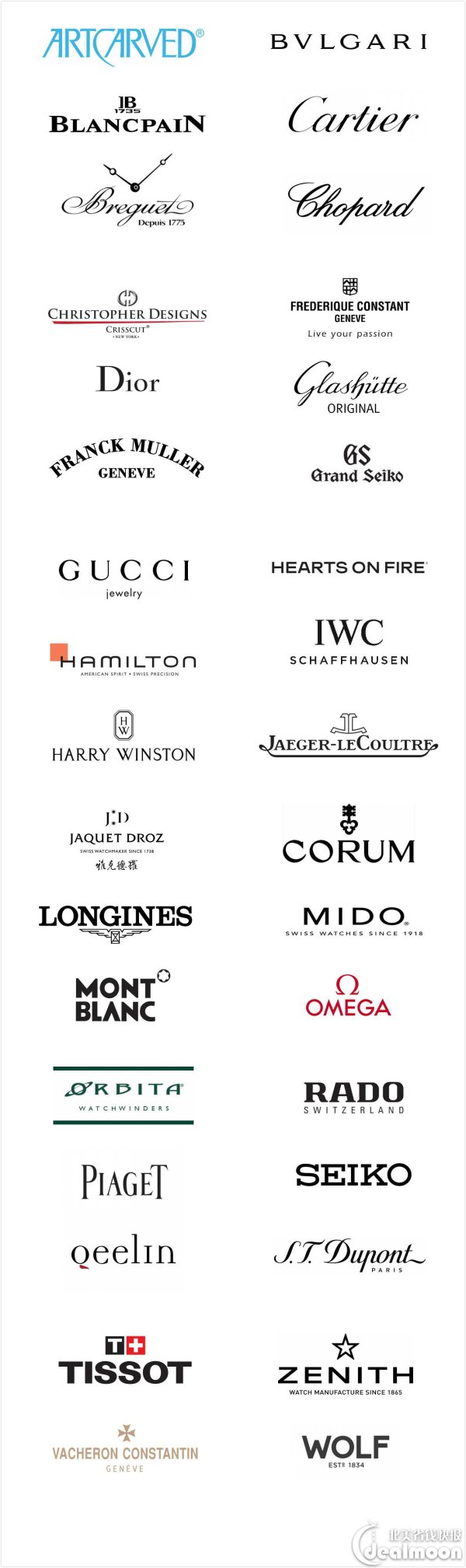 名表(Watch):Blancpain, Breguet, Bvlgari, Cartier, Chopard, Corum, Dior, Franck Muller, Frederique Constant, Glashutte Original, Grand Seiko, Gucci, Harry Winston, IWC, Jaeger-LeCoultre, Jaquet Droz, Longines, Mido, Montblanc, Omega, Piaget, Rado, Seiko, Tissot, Vacheron Constantin, Zenith